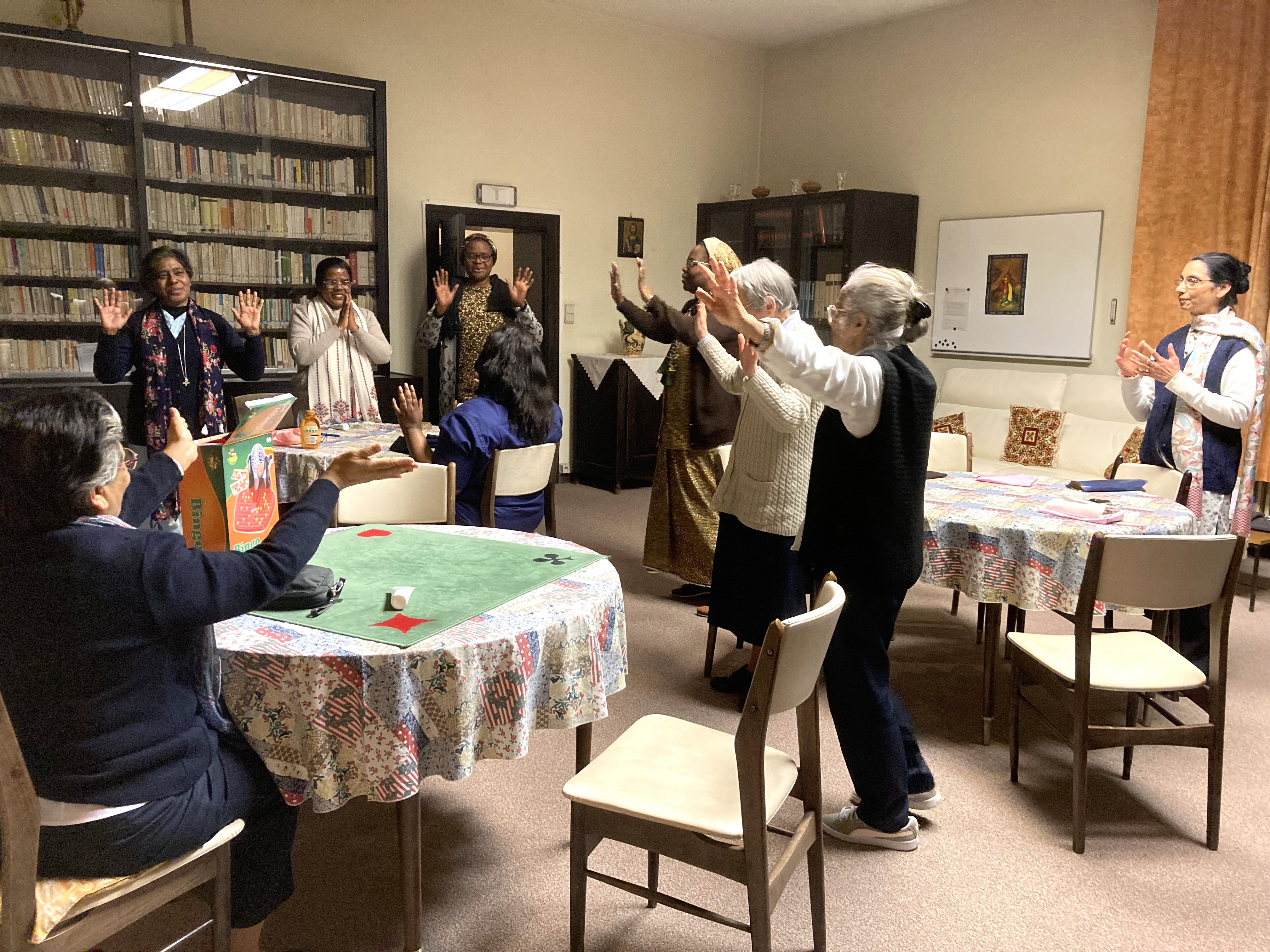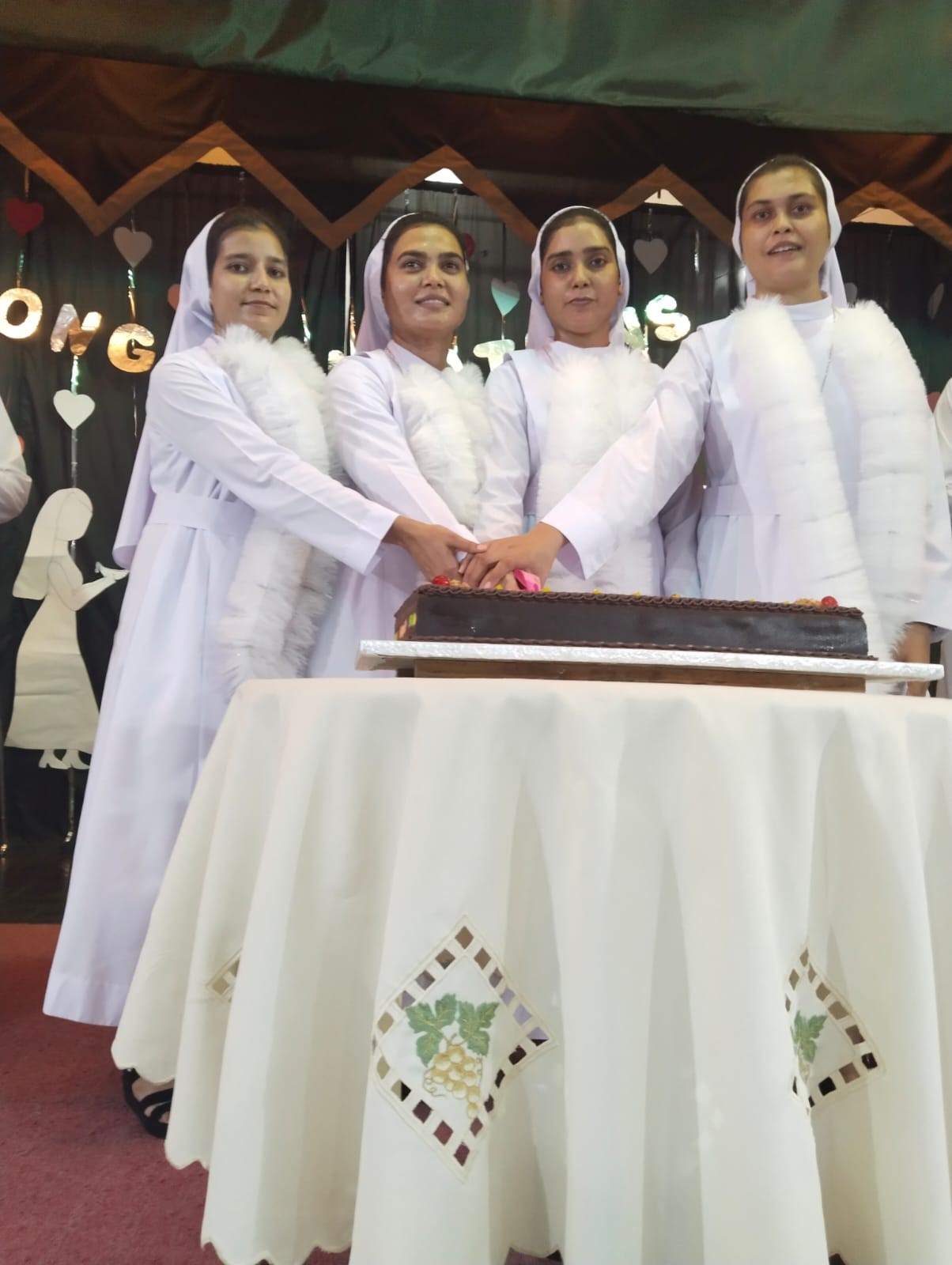 After the prayer and the blessing of the meal, the cardinal, the vice-provincial and the newly professed sisters cut the cake. In the meantime, the table was ready and the MC invited us to help ourselves. We joyfully shared the festive meal, accompanied by music and dancing.