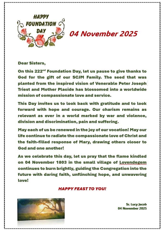 The 4th of November always evokes a profound sense of gratitude in the hearts of all the SCJMs, as we commemorate every year the birthing of our Congregation. This year we celebrated the 222nd year of its establishment and the elevation of our Founder Peter Joseph Triest to the status of the Venerable. On this auspicious occasion, the Delhi Province had the joy of celebrating the Perpetual Vows of five junior Sisters: Asha Murmu, Anisha Rani Gidh, Silbiya Barla, Anshu Xess and Pricilla Lakra. We rejoiced and gave thanks to God for their precious life and their total commitment and surrender to the Lord.