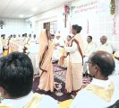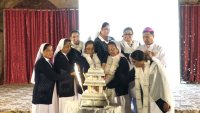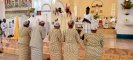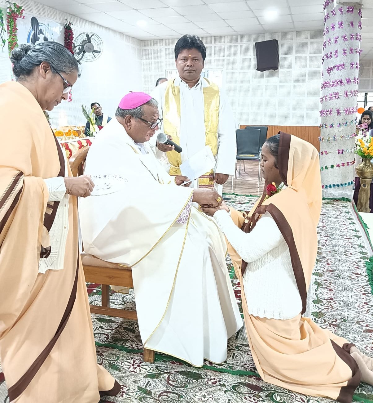 The Final Profession ceremony took place during the Eucharistic celebration which began at 10.30 a.m. with a beautiful entrance dance by the hostel students, while the four Sisters carrying lamps in their hands, accompanied by the Provincial, Sr. Mary Joseph, and her councilor Sr. Sushma Beck, the junior mistress Sr. Albina Mundu, the priests and the Archbishop Most Rev. Felix Toppo SJ, walked in procession to the altar. At the altar, they were welcomed by the traditional aarti and tikka and they placed the burning lamp on the altar as a symbol of their life, surrendering to Christ their spouse. The beautifully decorated auditorium was filled with many SCJMs, family members, invited guests and friends to share the joy, and witness this important event. There was an atmosphere of joy and gladness everywhere and on the faces of everyone.